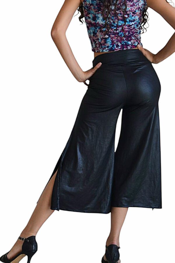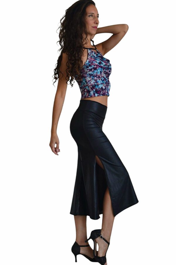 Pantalón capri confeccionado en seda fría engomada de excelente caída. Diseñado con una cintura alta que estiliza la silueta y brinda sujeción, mientras que los tajos laterales —uno a cada lado— permiten moverse con total soltura y un toque de sensualidad. Perfecto para prácticas intensas o noches de milonga, donde el cuerpo necesita ropa que acompañe el ritmo sin perder elegancia.